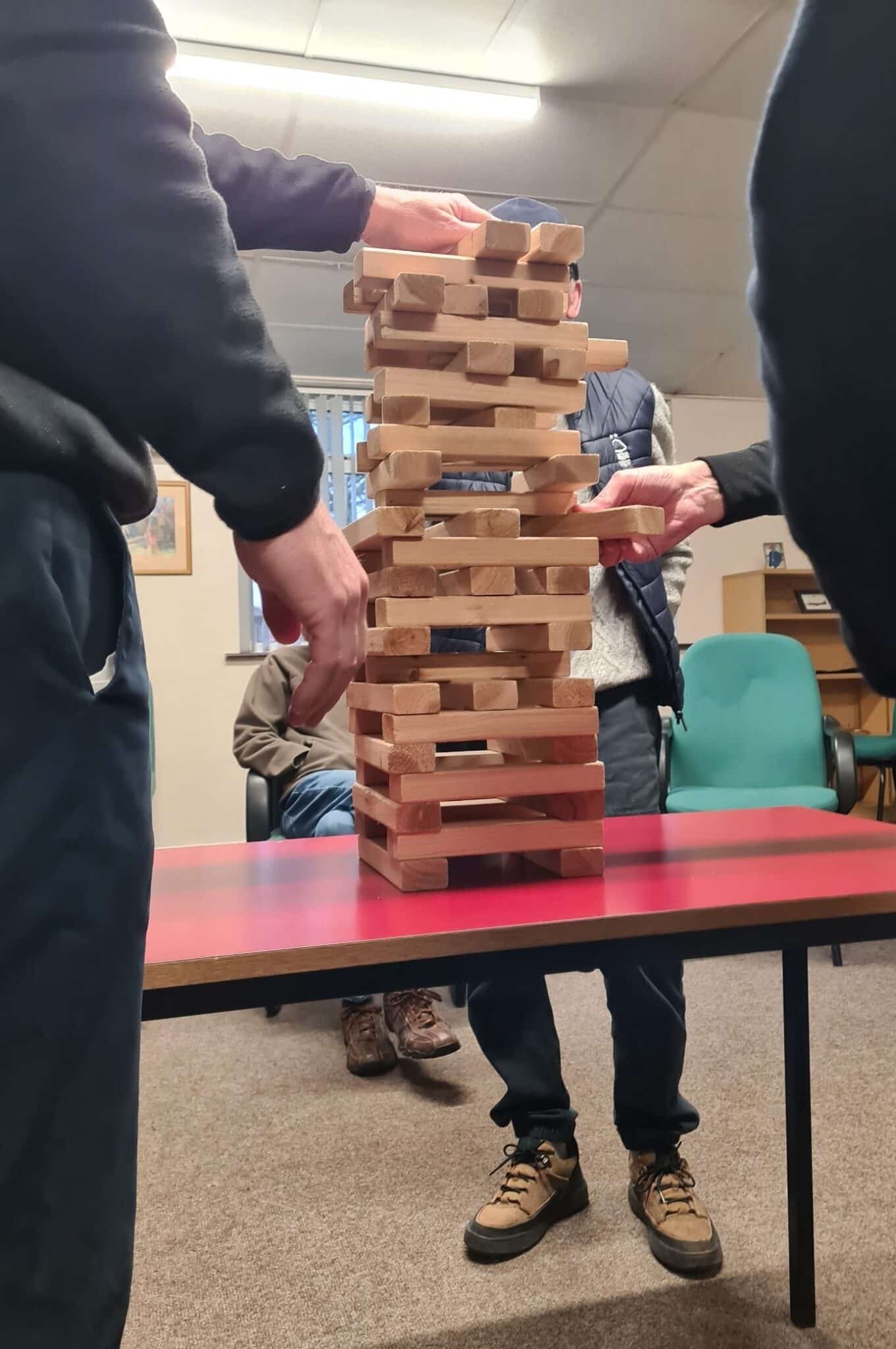 The care partners use the hour while the men are gone to share advice and support, in the presence of one volunteer with dementia knowledge and experience. For some this is the only time in the week when they can get out and meet people. A feature of this part of the session is the laughter shared with people who have so much in common. Over the years, we have lost members to the progression of dementia. Nonetheless, by attending, they have built up important connections and happy memories. When the Jenga tower finally collapses with a clattering noise, we know it’s time to go home.